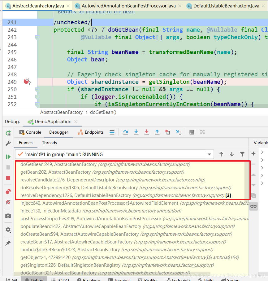 调用栈如下:getBean=> doGetBean=> getSingleton,又是熟悉的步骤,但这次 getSingleton(String beanName) 中发生了不一样的事:能够获得 A 的缓存。