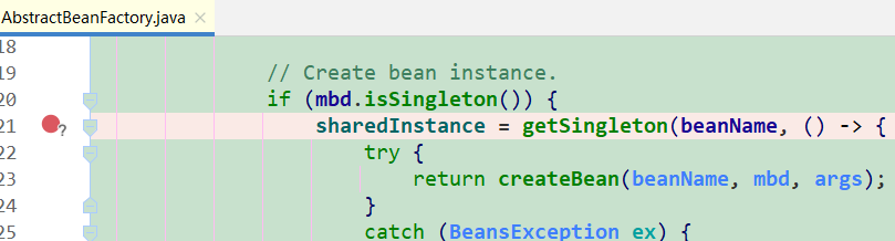// 为什么不在getSingleton里边打断点?因为getSingleton除了获取bean之外,其他也有地方调用了,会影响我们本处的分析。