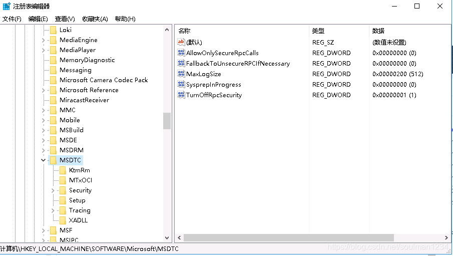 设置MSDTC 注册表,添加SysprepInProgress,同时修改其他值(路径在截图左下方):