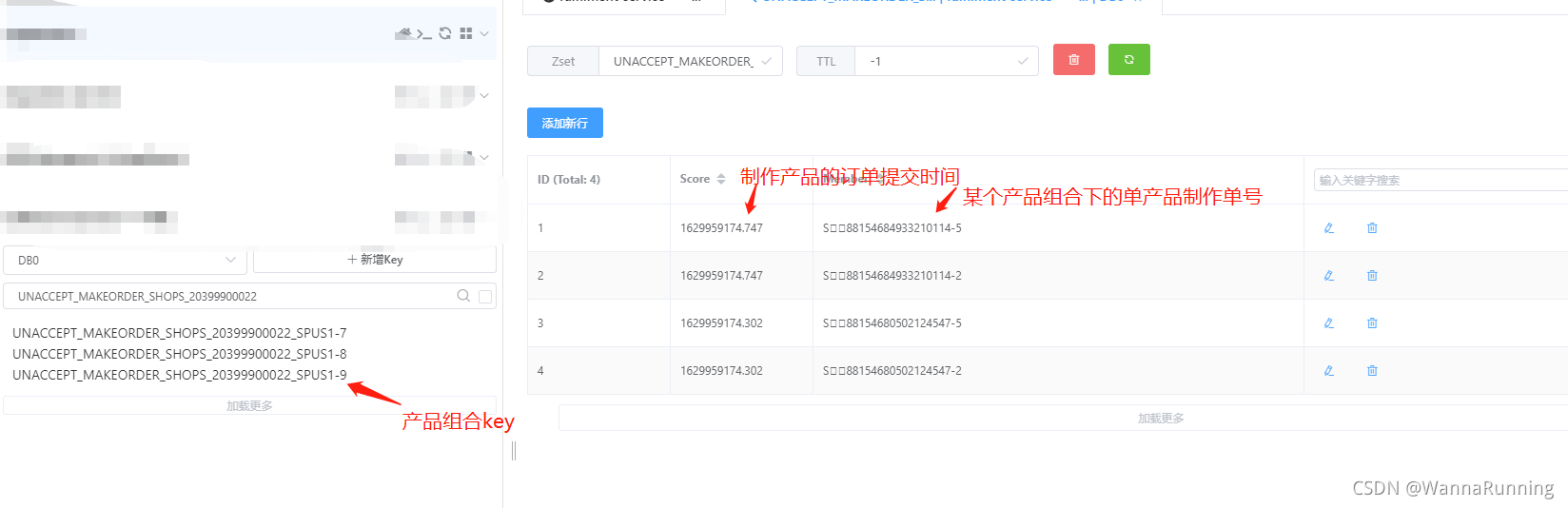 把订单拆分后单分组后的产品组单号ProductNo,以订单提交时间为对应的score放入ZSET中 。这里要说明一下,制作队列中数据是以一个制作单组合为原子粒度,也就是说制作队列中不区分订单,之所以这么存储,是因为这样能保证产品的制作在订单粒度是并行的。怎么理解呢?