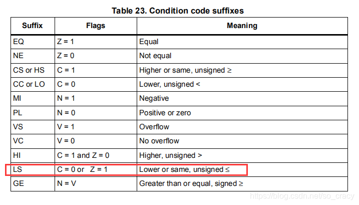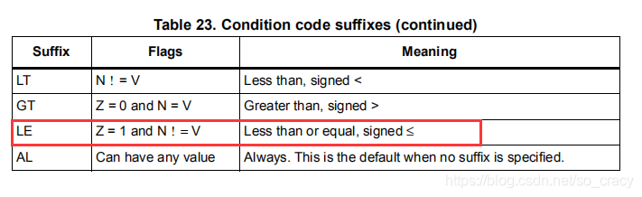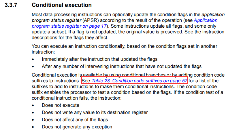 可选条件码在刚文档的表23, Table 23: Condition code suffixes on page 57: