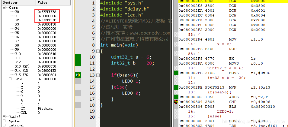 最后得到的结果就是a+b = R0=0xFFFF FFF2,而这个R0的值,到底是把它当有符号看,还是无符号看,就要看后面的指令了,STM32就只是个存储。