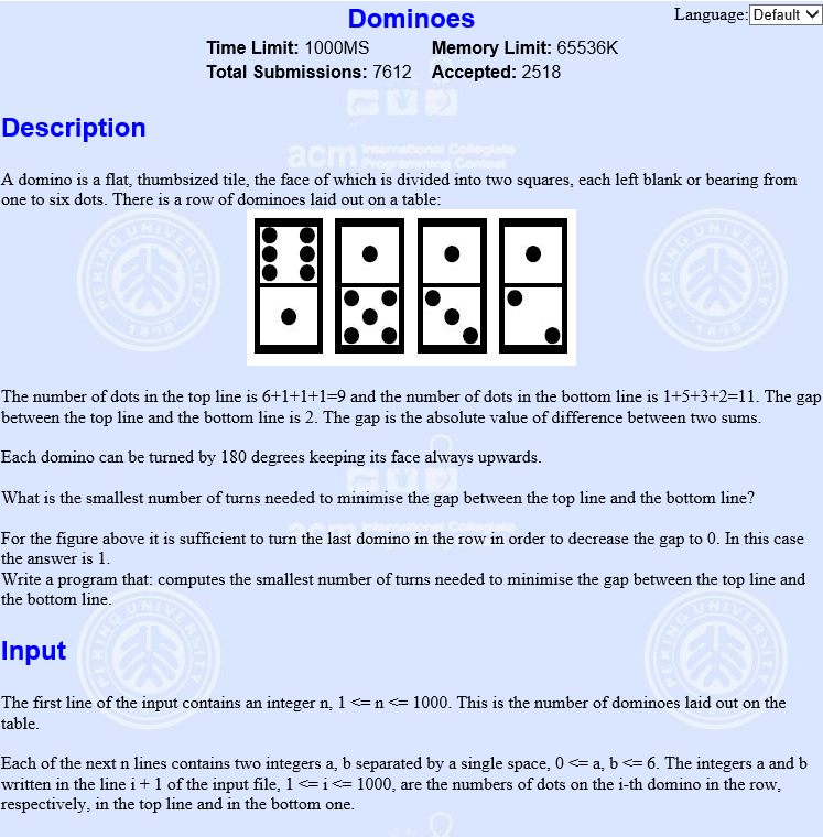 本文主要是介绍POJ 1717 Dominoes G++ 动态规划 背,希望对大家解决编程问题提供一定的参考价值,需要的开发者们随着小编来一起学习吧!