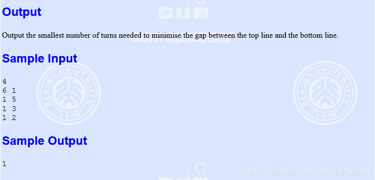 {int n;scanf("%d",&n);for(int i=1;i<=n;i++){cin>>up[i]>>down[i];}memset(dp,0x3f,sizeof(dp));//dp[0][6000]=0;//抄博友程序 int cha=up[1]-down[1];dp[1][cha+6000]=0;dp[1][6000-cha]=1;for(int i=2;i<=n;i++){for(int j=0;j<=12000;j++){cha=up[i]-down[i];if(j-cha>=0){dp[i][j]=min(dp[i][j],dp[i-1][j-cha]);//抄博友程序 }if(j+cha<=12000){dp[i][j]=min(dp[i][j],dp[i-1][j+cha]+1);}}}for(int i=0;i<=6000;i++){int ans=min(dp[n][i+6000],dp[n][6000-i]);if(ans<1000){cout<<ans<<endl;break;}} return 0;