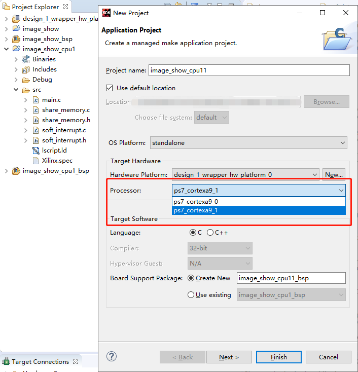 可以看到,总共有16个软中断可以利用,我这里只用到了两个,另外需要说明的一点是,软中断不但可以核之间相互触发,核本身也可以利用软中断触发自己。话不多说,开搞,先从核1的说起,核1不像核0要从卡里读图,所以BSP这边并不要什么额外的库的支持。只是创建程序的时候需要注意一下。