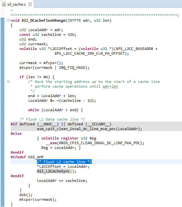 至于这个DUSE_AMP选项影响的是哪里,看下CACHE这边你就明白了,这里只是拿Xil_DCacheFlushRange来举例而已,还有很多约束L2 Cache的地方,感兴趣的可以自己打开来看。