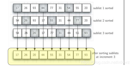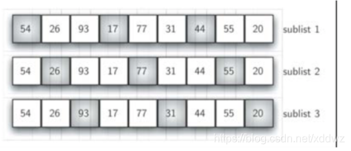 间隔为3的子列表,子列表分别插入排序后的整体状况更接近有序。