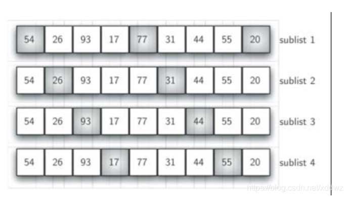 在这种情况下,谢尔排序以插入排序为基础,对无序表进行“间隔”划分子列表,每个子列表都执行插入排序。
