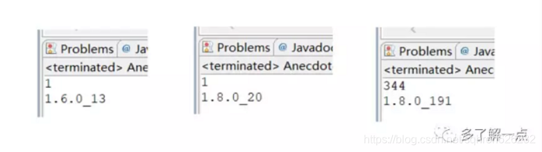 于是我也翻了一下我的1.8版本的jdk出来,诶,厉害了,我的还是打印的1。这就让我懵逼了,看来这个问题不是在jdk的大版本中做的改动啊。我于是上官网下载了最新版本的jdk,果然就变成了他给我的结果。以下是我几个版本的测试结果: