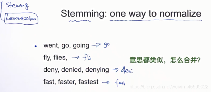 lemmazation:与stemming区别是转换成统一格式的词,该词是真实存在的。