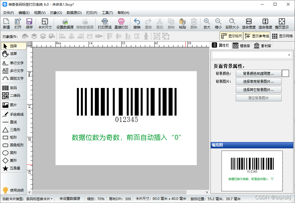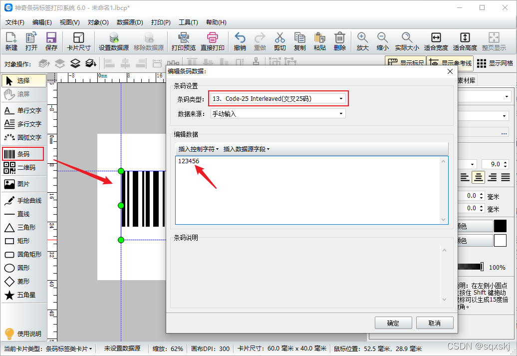 在条码标签软件中制作这种条码时,点击左侧“条码”按钮,在画布上绘制一个条形码,在弹出的编辑界面设置条码的类型为交叉25码,在编辑数据处输入条码数据。