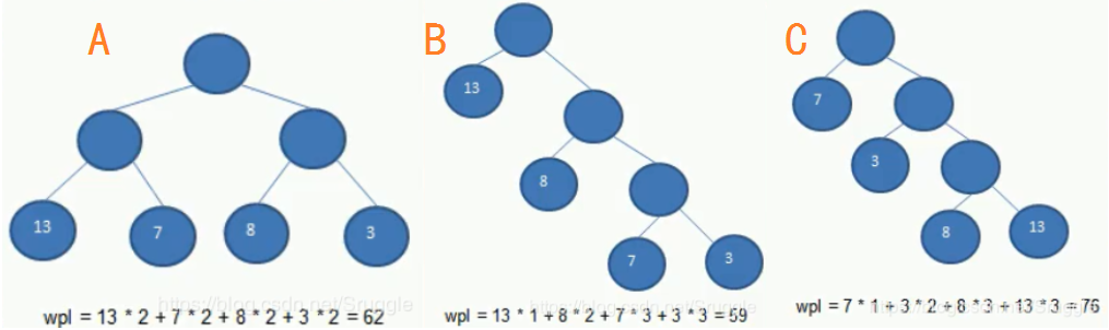 - 对于A,值为13的叶子结点的WPL = 13 * 2 = 26;