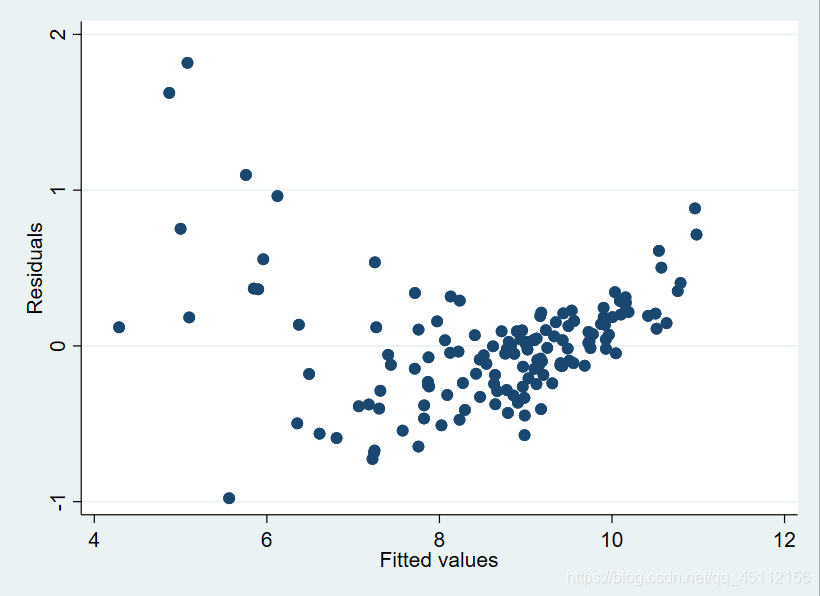 rvfplot #本命令旨在绘制残差与回归的到的拟合值的散点图,从而探索数据是否存在异方差