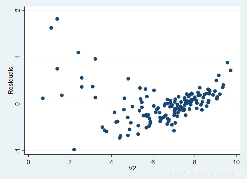 rvpplot V2 #本命令旨在绘制残差与解释变量V2的散点图,从而探索数据是否u才能在异方差。