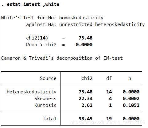 estat imtest,white #本命令为怀特检验,旨在检验数据是否存在异方差