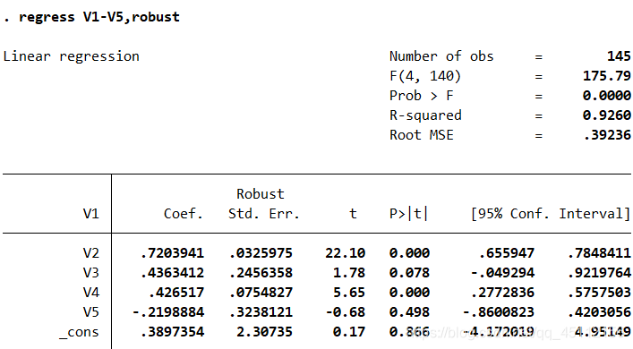 regress V1-V5,robust #本命令为采用文件的标准差对数据进行回归分析,克服数据的异方差对最小二乘回归分析造成的不利影响
