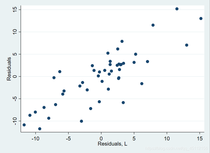 scatter e l.e #本命令旨在绘制残差与残差滞后一期的散点图,用于探索数据是否存在一阶自相关