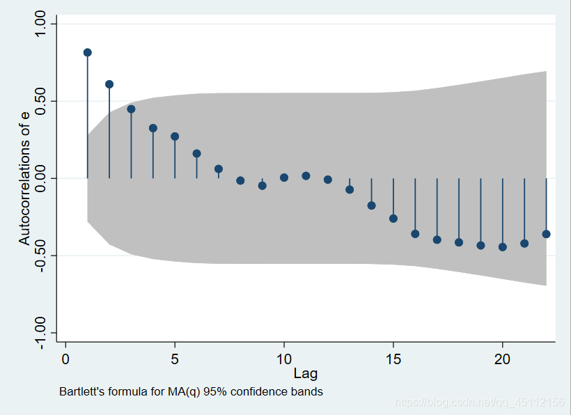 图中横轴代表滞后阶数,阴影部分表示95%的自相关置信区间,在阴影部分之外表示自相关系数显著部位0.从图中可以看出数据主要存在一阶自相关。