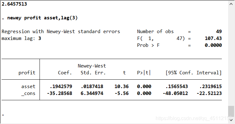 newey profit asset,lag(3) #本命令为采用异方差自相关稳健的标准差对数据进行回归分析,克服数据的自相关性对最小二乘回归分析造成的不利影响。