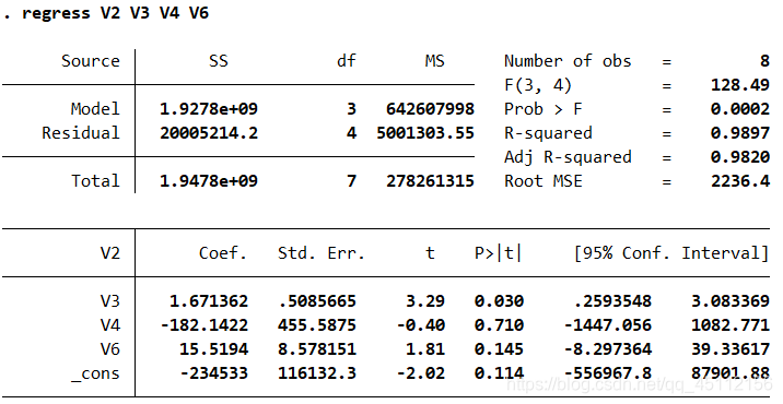 regress V2 V3 V4 V6 #对4个变量进行回归分析
