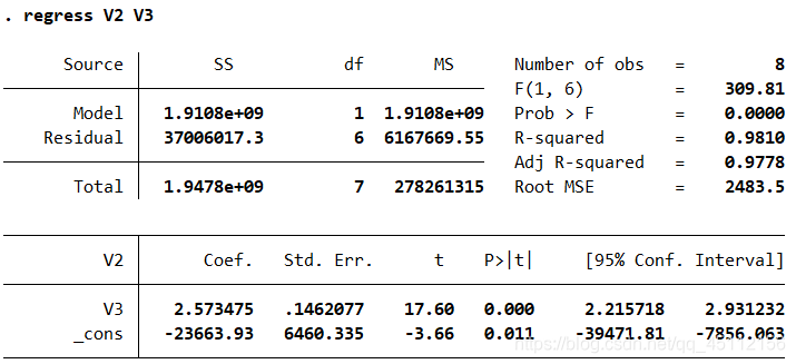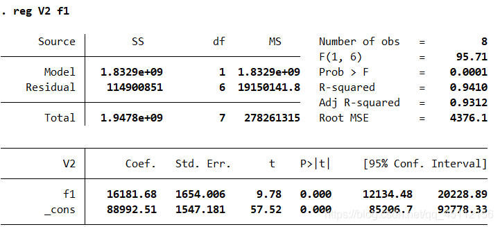 regress V2 f1 #对两个变量进行回归分析