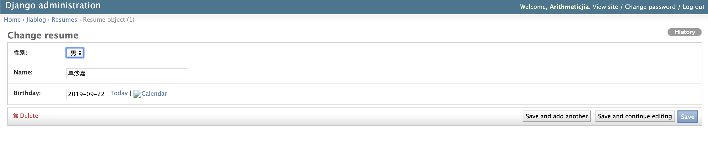 class Resume(models.Model):GENDER_CHOICES = (('male', "男"),('female', "女"),)id = models.AutoField(primary_key=True)sex = models.CharField(max_length=5,choices=GENDER_CHOICES,default="male",verbose_name="性别")name = models.CharField(max_length=10)birthday = models.DateField()