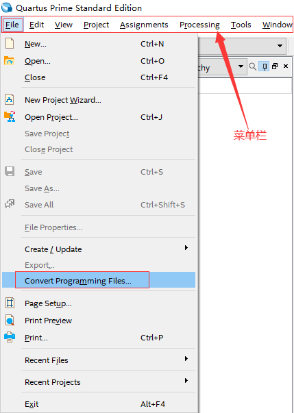 首先,将工程全编译,编译完成之后,点击Quartus界面的菜单栏中File->Convert Programming File,如图所示: