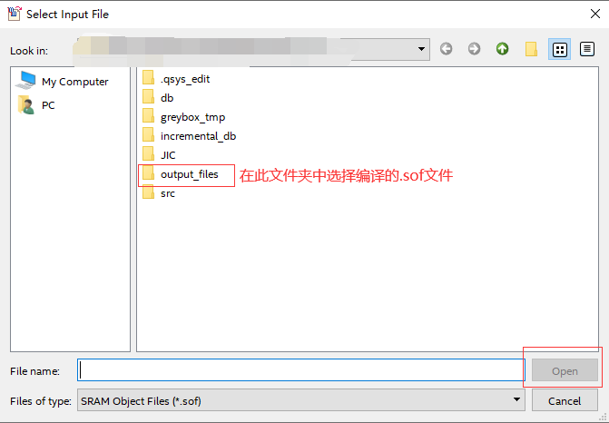 工程编译完成之后,一般在工程下的output_file文件件下会生成.sof文件,这个就是我们需要寻找的转换源文件,点击Open。如图所示: