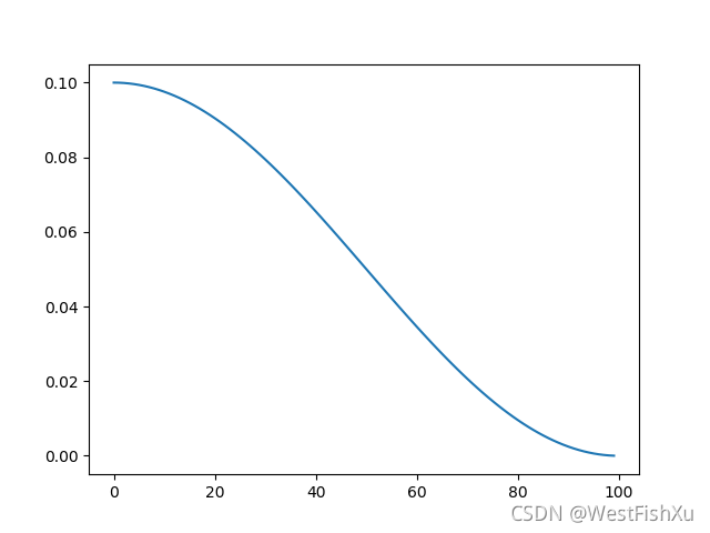 学习率呈余弦函数型衰减,并以2×Tmax为余弦函数周期,epoch=0对应余弦型学习率调整曲线的x=0,ymax=lr,epoch=Tmax对应余弦型学习率调整曲线的x=Π,ymin=etamin处,随着epoch>Tmax,学习率随epoch增加逐渐上升,整个走势同cos(x)。