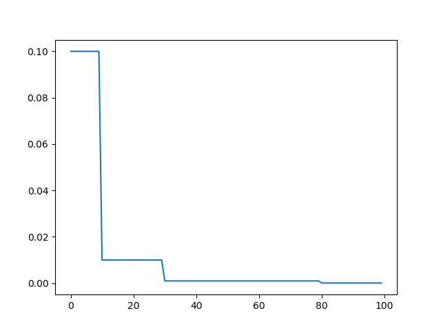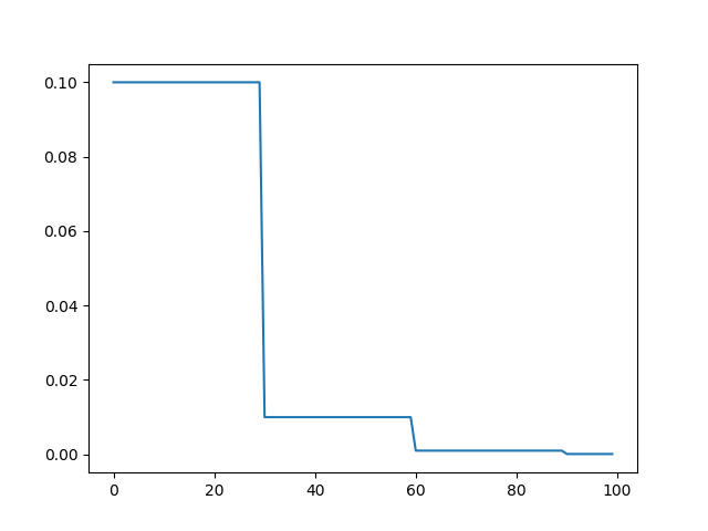 scheduler = torch.optim.lr_scheduler.StepLR(optimizer, step_size=30, gamma=0.1)def train(...):for i, data in enumerate(train_loader):......y_ = model(x)loss = criterion(y_,y)loss.backward()optimizer.step()......for epoch in range(epochs):train(...)test(...)scheduler.step()
