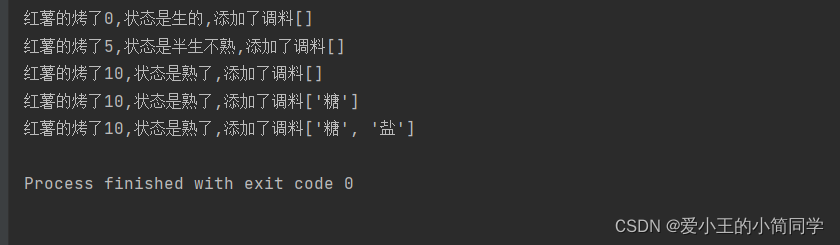 class SweetPotato():def __init__(self):self.cook_time = 0self.cook_state = '生的'self.cook_seasoning = []def cooked_time(self, time):self.cook_time += timeif 0 <= self.cook_time < 5:#状态是生的self.cook_state = '生的'elif 5 <= self.cook_time < 10:#状态是半生不熟self.cook_state = '半生不熟'elif 10 <= self.cook_time < 15:#状态是熟了self.cook_state = '熟了'elif self.cook_time >=15:#状态是糊了self.cook_state = '糊了'def __str__(self):return f'红薯的烤了{self.cook_time},状态是{self.cook_state},添加了调料{self.cook_seasoning}'def cooked_seasoning(self, seasoning):self.cook_seasoning.append(seasoning)