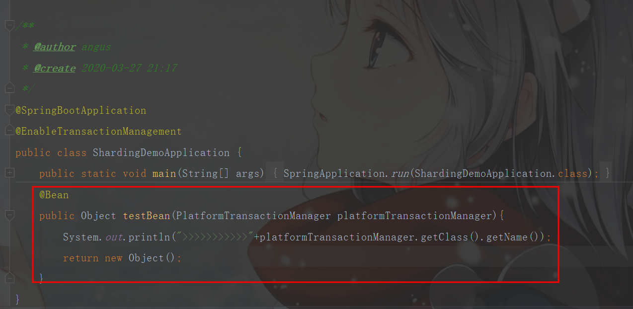 @Beanpublic Object testBean(PlatformTransactionManager platformTransactionManager){System.out.println(">>>>>>>>>>>"+platformTransactionManager.getClass().getName());return new Object();}