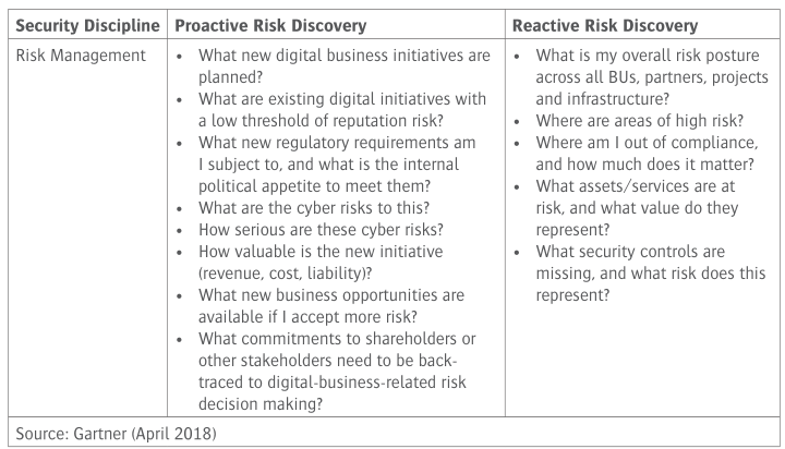 我们的风险治理和遵从性流程遭受了我们前面讨论过的一次性宏安全门评估的相同限制。我们使用严格而冗长的控制和合规检查表来衡量我们的安全程序的有效性。我们需要结合CARTA的风险管理战略方法,摆脱静态的检查清单,使数据驱动的风险可见性和评估成为一个持续的过程。这种思维模式被Gartner称为集成风险管理(IRM;和前面一样,可以主动和被动地评估这一数字业务风险(见表3)。