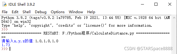 d=distance(float(x),float(y),float(z))#调用distance函数