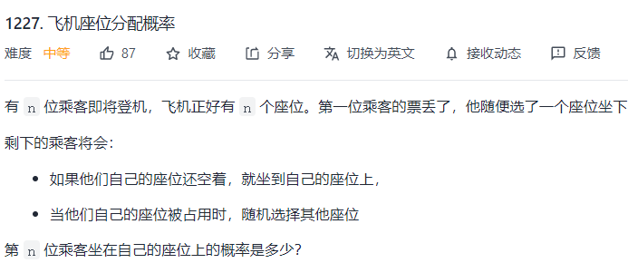 本文主要是介绍力扣:1227. 飞机座位分配概率,希望对大家解决编程问题提供一定的参考价值,需要的开发者们随着小编来一起学习吧!