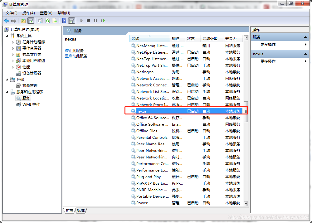 2、命令行输入:nexus.exe /install 可以将nexus作为一项windows服务安装,安装后可以在,计算机-管理-服务和应用程序-服务 中看到已安装成功的服务