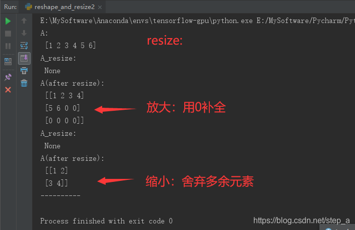resize 可以放大或者缩小原数组的形状:放大时,会用0补全剩余元素;缩小时,直接丢弃多余元素。