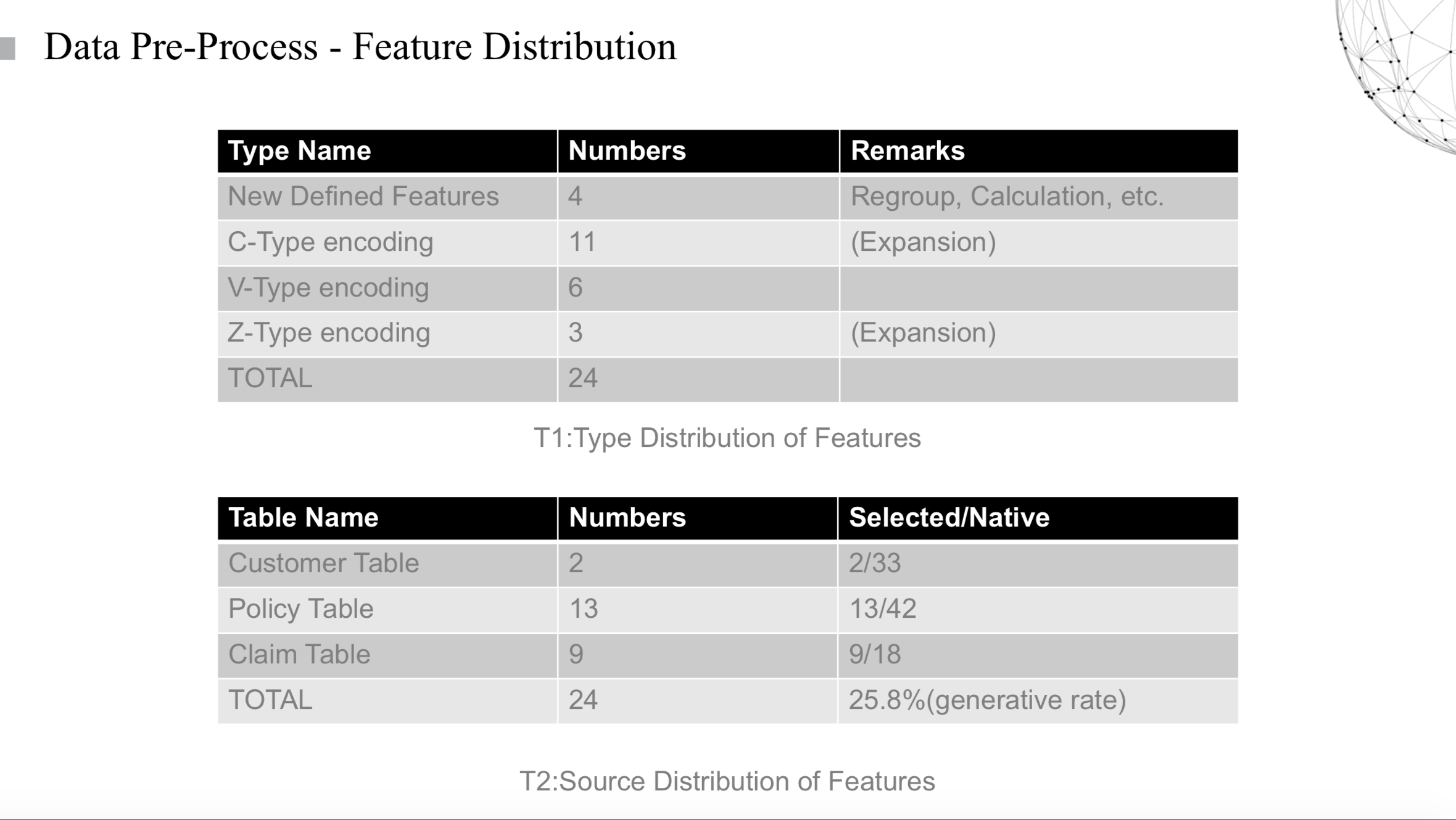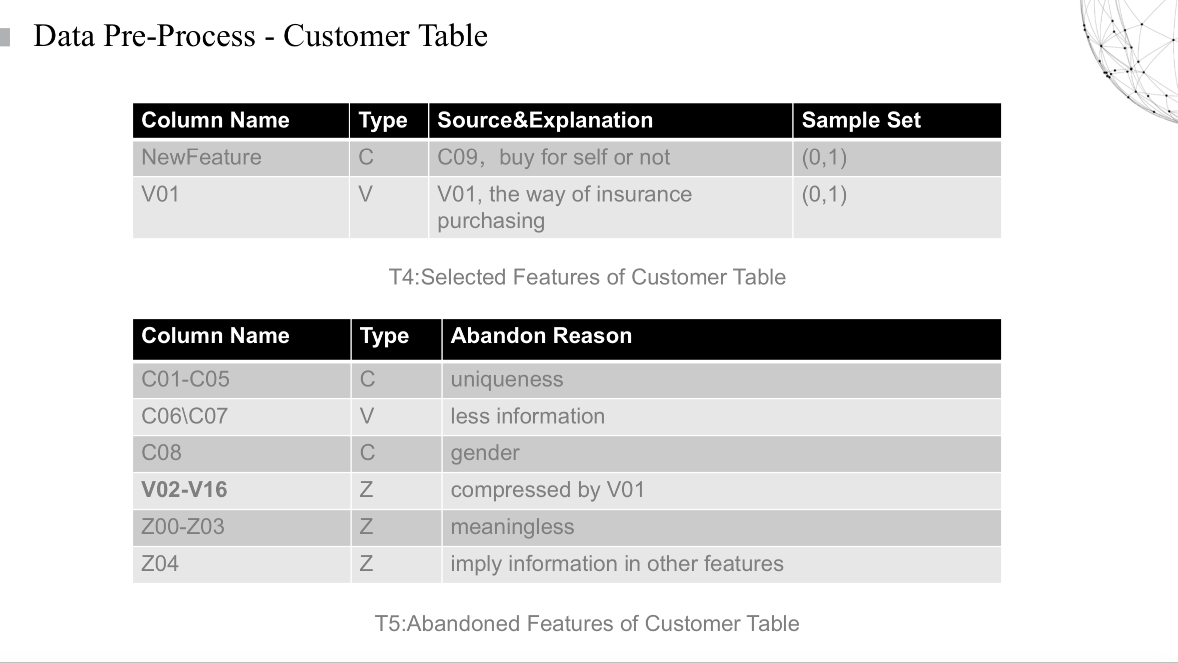 C02是我们重新定义的一维数据,其中的内容就是为了判断这份保单是否是用户为自己购买的,这个信息可以从表单的对应的人数中看的出来,因为每一张保单对应的角色一共有三个,投保人、被保人和受益人,一般只有都是同一个人,和有两个人的情况(至少我们在比赛的过程中没有出现有三个不同的人充当单个角色)。