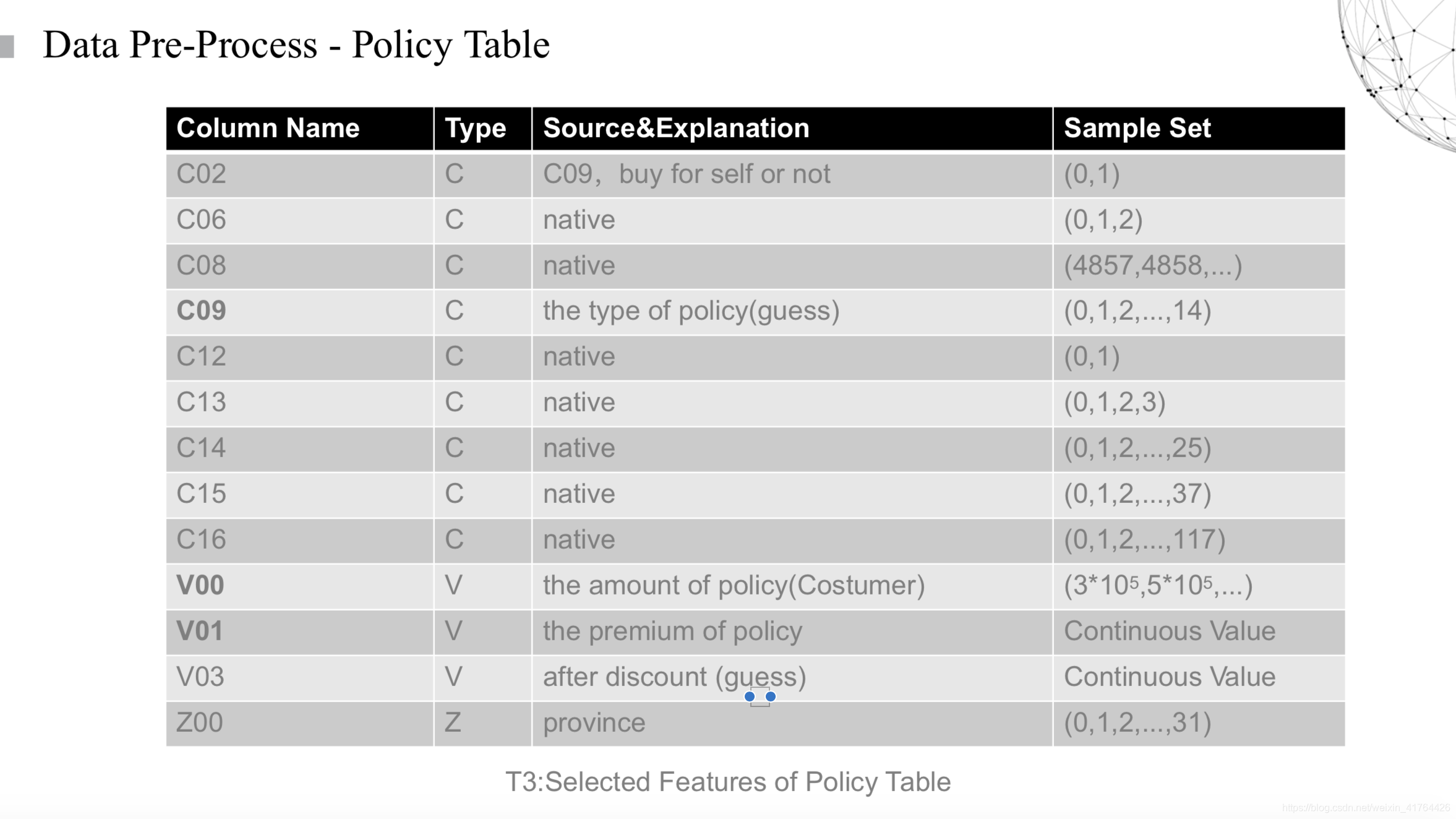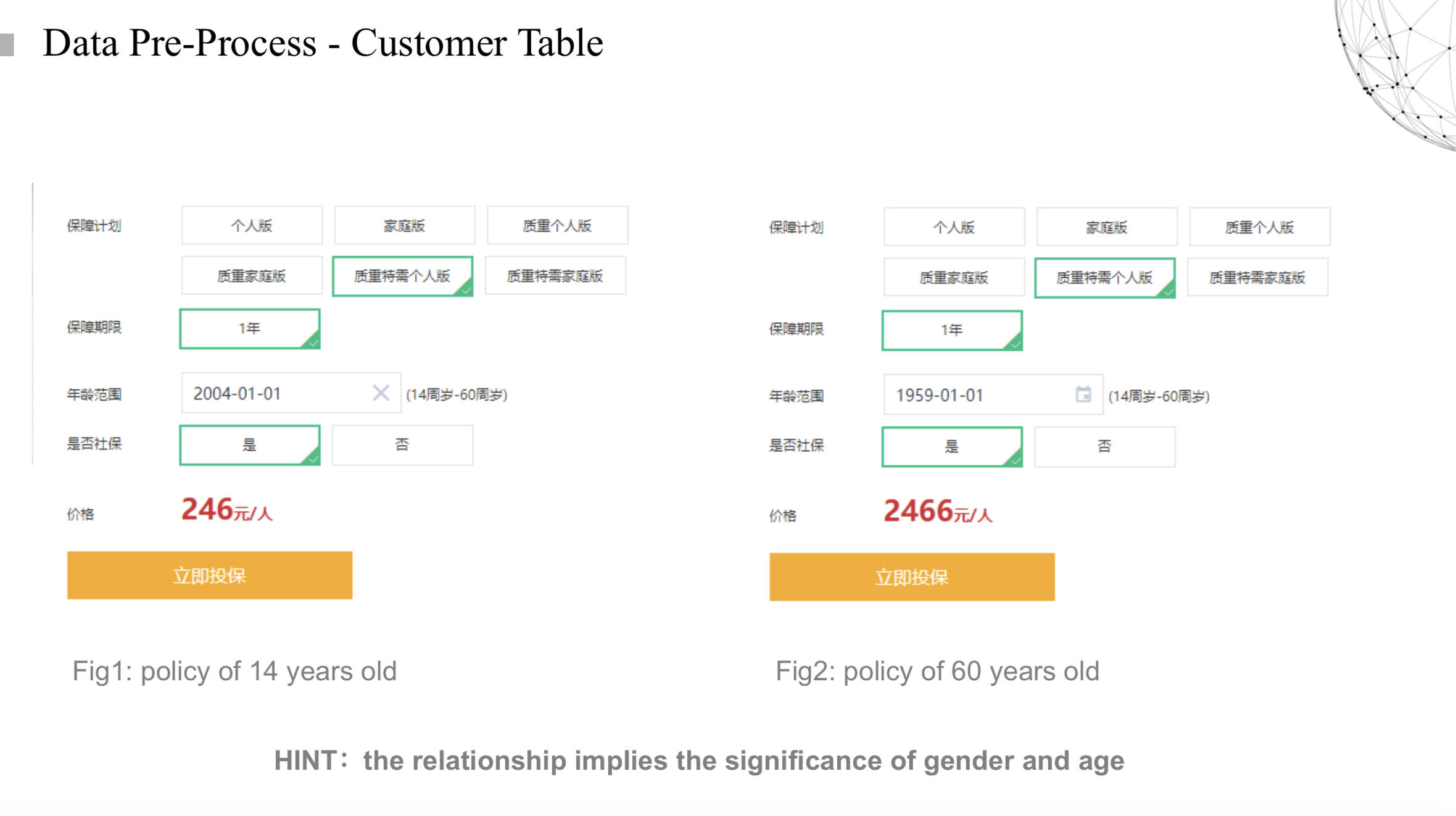 主要针对的就是不同的保单,我们可以看到有用户信息,同时这些保单是在什么样的状态下生成的,最后是否续报了(label)。