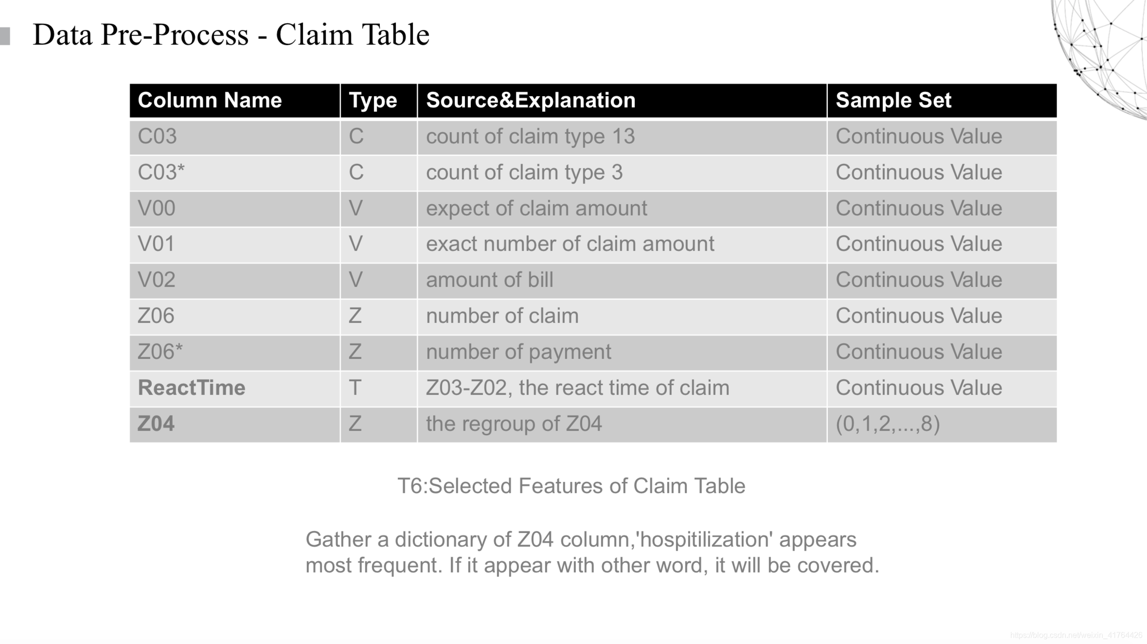 最后一张表是保险赔付的表单,其中主要是用户产生了赔付行为,其中一些赔付款项,实际赔款,以及我们经过特殊处理的反应时间。在赔付行为和赔付的反应服务上,可能也会对用户的最后续保行为产生影响。