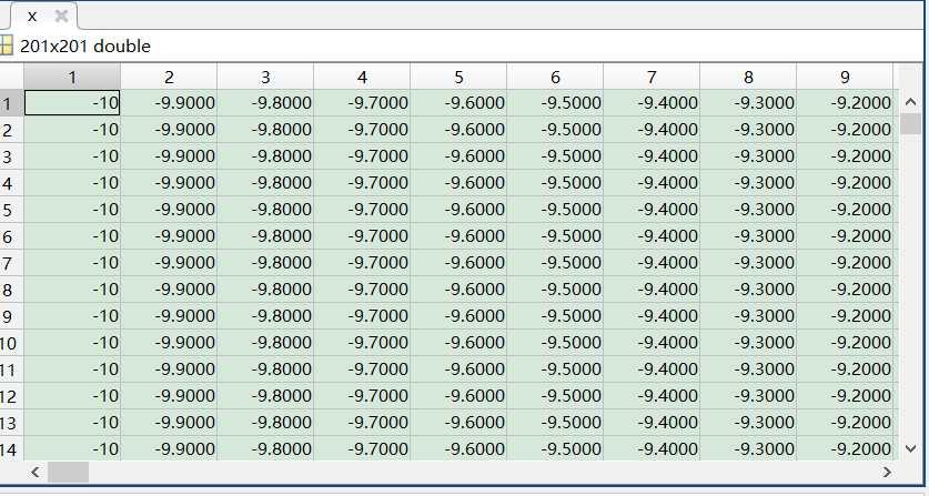 以如下代码为例,其绘制出的图形的二维平面的范围与X和Y相同,是一个矩阵,该矩阵如下所示(这里仅展示x的矩阵)。