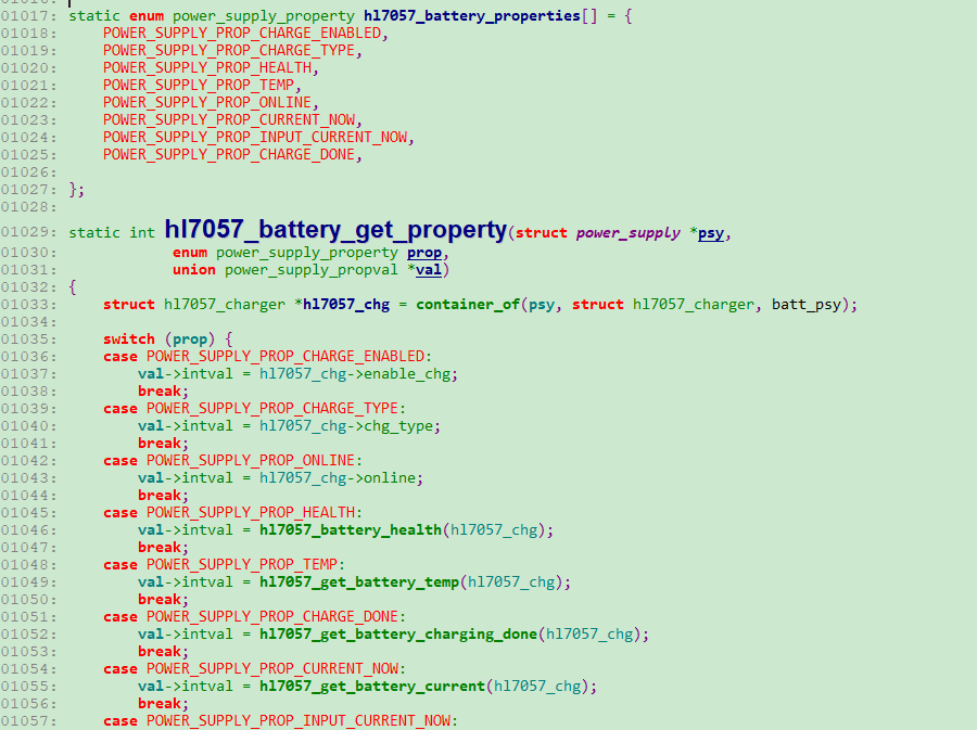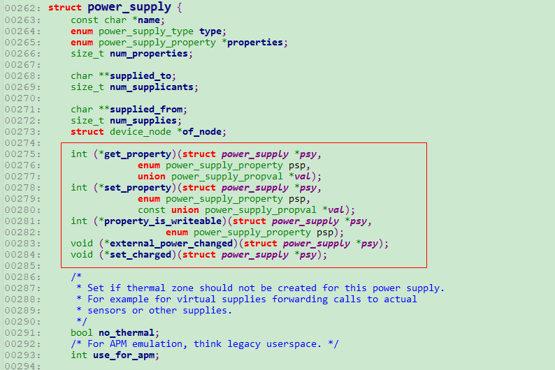 上述的power_supply的相关属性,是在power_supply的框架里的内容的一部分,由于power_supply的电源管理框架将大部分的属性都做了枚举,我们根据具体的充电IC,进行部分的实现,在get_property中进行具体的实现,这样的结果就是可以在具体节点下cat到具体的值。