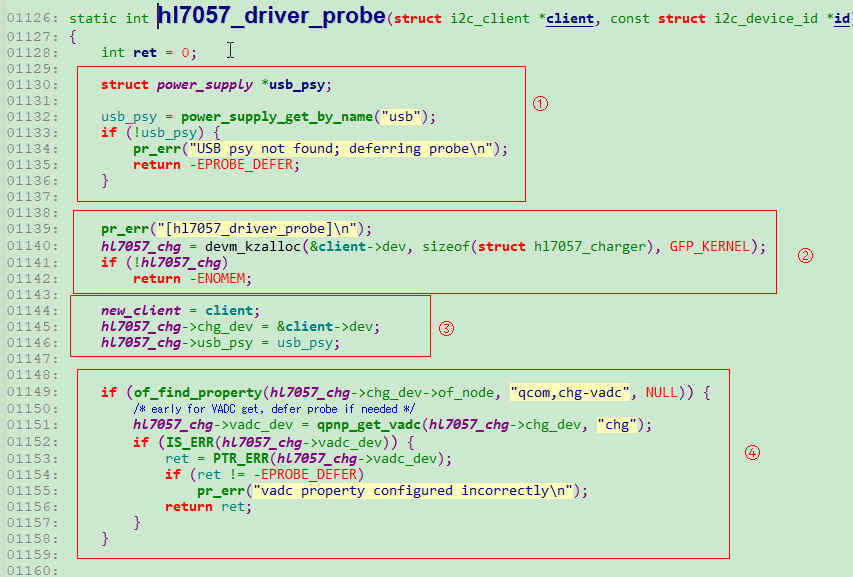 - 由于充电IC驱动的结构体中,存在usb_psy的成员指针变量,所以,在probe中,需要将usb_psy进行实例化,通过power_supply_get_by_name获取usb的电源相关的驱动文件,并将地址赋给power_supply类型的usb_psy指针。
