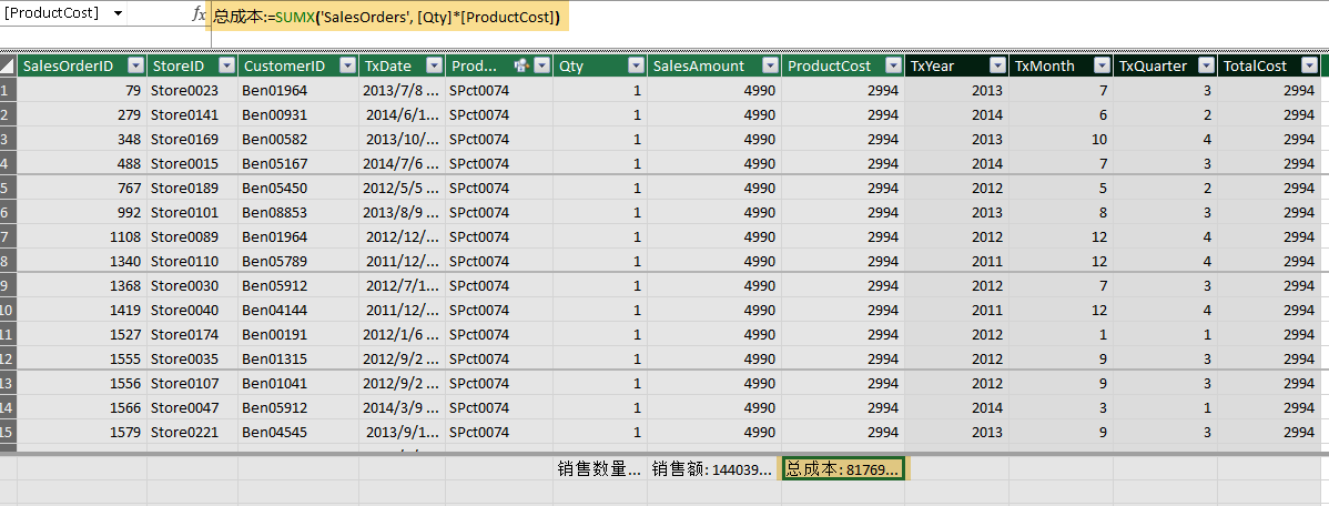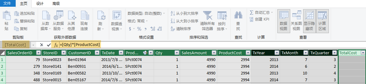 用上一篇的数据。进入 Power Pivot 环境,切换到 SalesOrders 表。其实上一篇我们已经添加了 TxYear, TxMonth 和 TxQuarter 几个计算列。本篇再添加一个计算列,复习一下。SalesOrder 表包含 Qty 列和 ProductCost 列。将 Qty * ProductCost 就得到每一行的总成本: