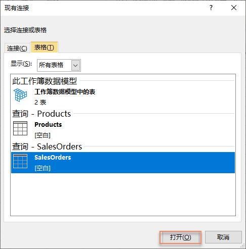 连接后可以看到,Products 表和 SalesOrders 表已经被加载。