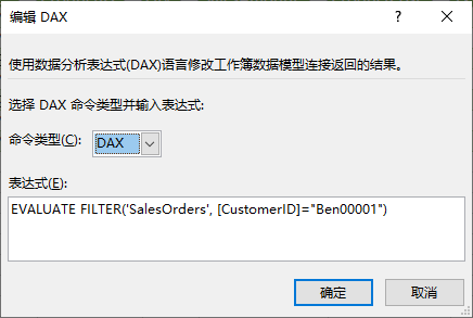 点击确定按钮,这样只有 CustomerID 为 Ben00001 的数据被显示。以上的表达式是一个 DAX 查询。所有的 DAX 查询以 EVALUATE 关键字开始,后面跟一个表达式。FILTER 函数用于对对 table 的数据进行筛选,该函数有两个参数: