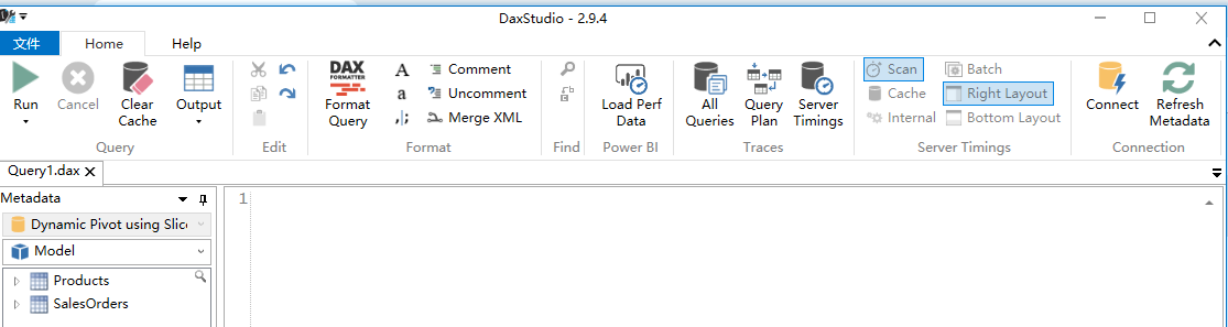 在 DAX Studio 的查询编辑区,可以进行 DAX 查询语句的编写,查询的结果可以导出,或者重新加载到 Excel 工作表。编写 DAX 查询,DAX Studio 的主要好处是有提示,并且可以对代码格式化。