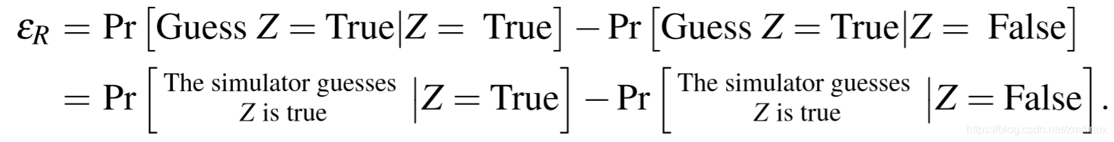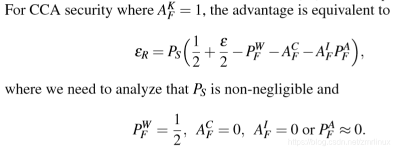 由上式子可知,敌手的优势只与模拟成功的概率,敌手能攻破正确挑战密文的概率,敌手能攻破错误挑战敏文的概率。这三个概率有关,模拟成功的概率是非常明确的,即为不中断,敌手不可区分的概率,敌手能攻破正确密文的概率也是明确的,敌手能够攻破错误密文的概率尚且还没有讨论。