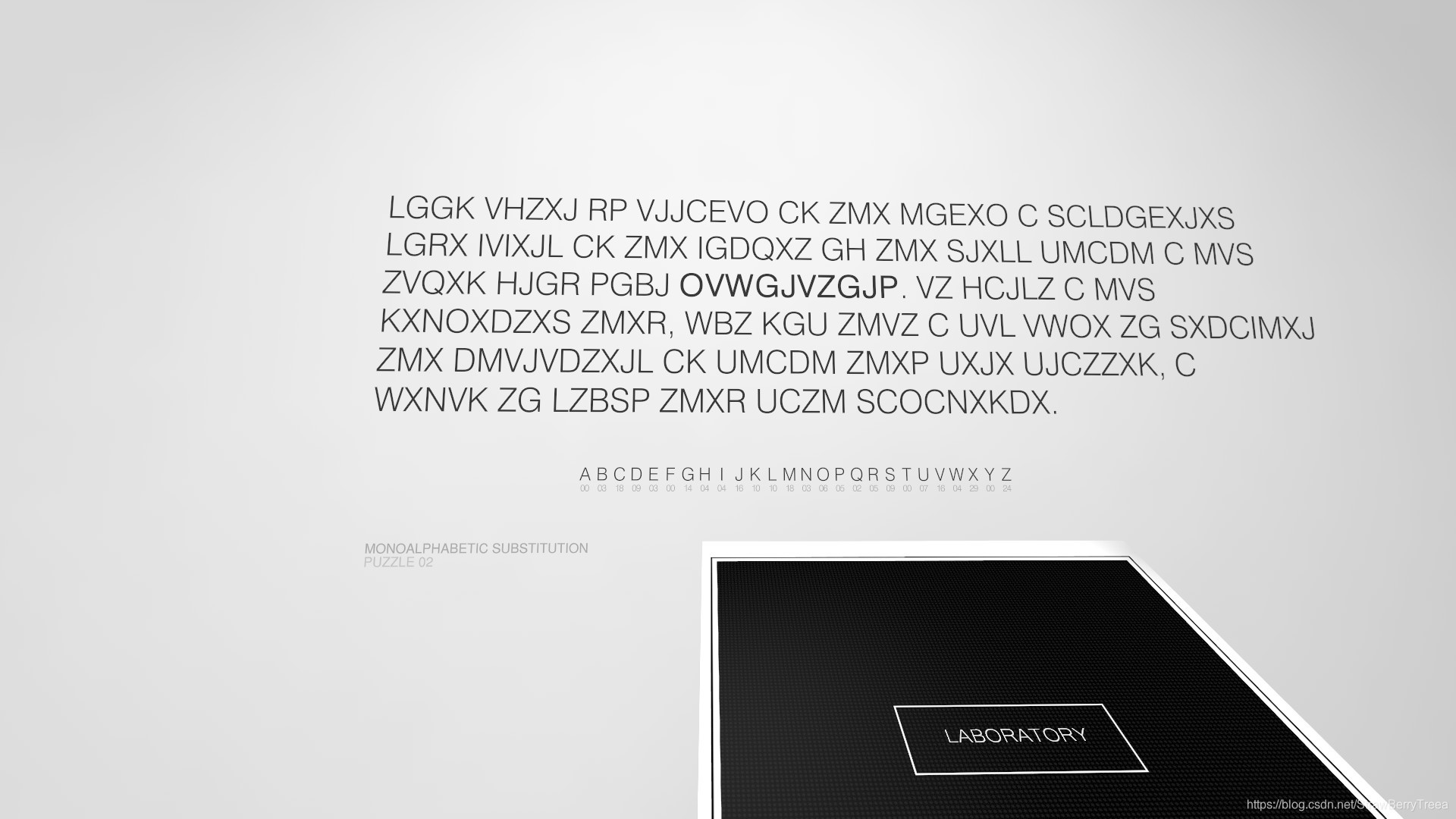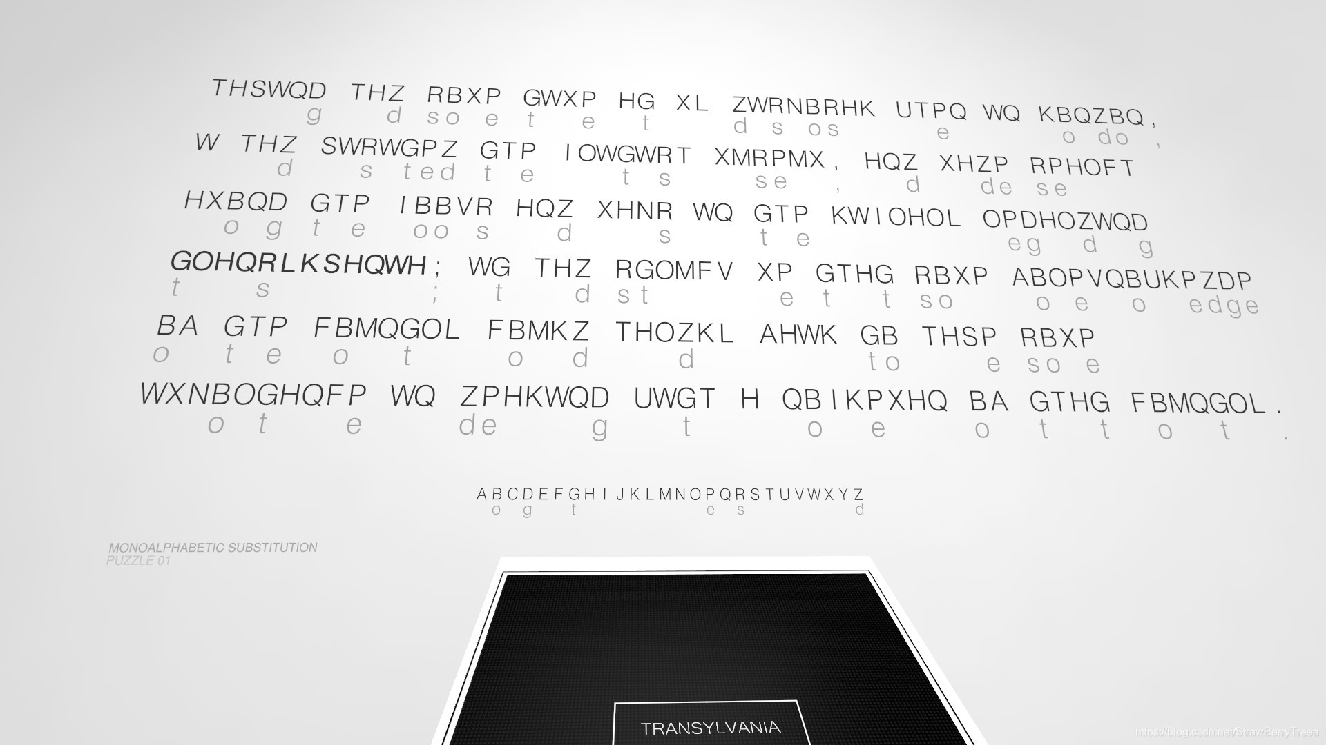 上边一排黑色字母是加密过的密文,下边浅色的是明文,已经有一些对应的字母给出来了
