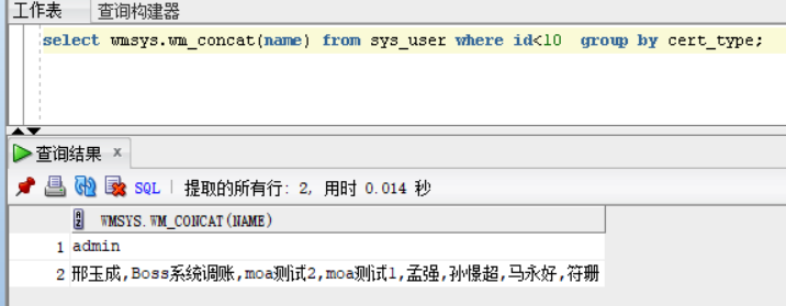 wmsys.wm_concat()使用方式:该函数返回来自同一个分组的指定字段的非NULL值的连接起来字符串。